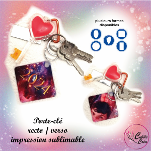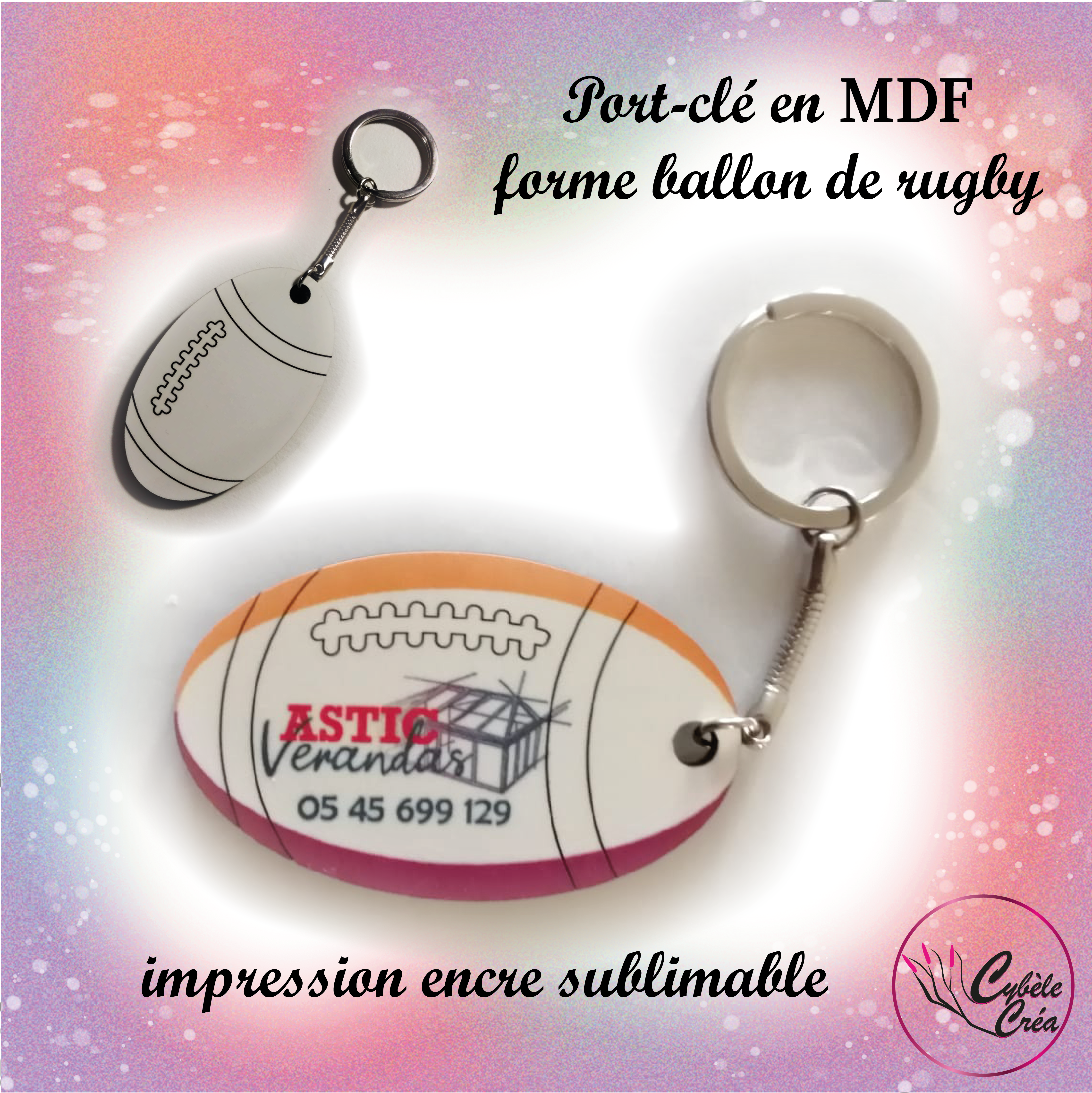- Porte clés en MDF de diverses formes, impression une face (ovale, fleur, hexagonal, triangle et ballon de rugby)